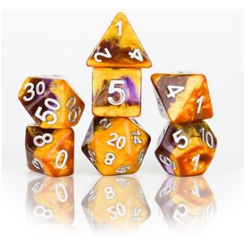 The Amethyst Geode set features 7 polyhedral dice of golden substrate intermixed with veins of sparkling purple. Each set includes a 1 extra D20 and comes packaged in a flat-bottom tube, for easy carrying and storage.