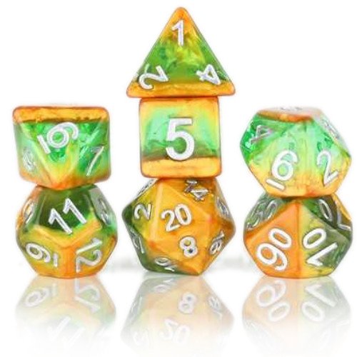 The Rainforest set features 7 polyhedral dice of vibrant green intermixed with shining gold. Each set includes a 1 extra D20 and comes packaged in a flat-bottom tube, for easy carrying and storage.